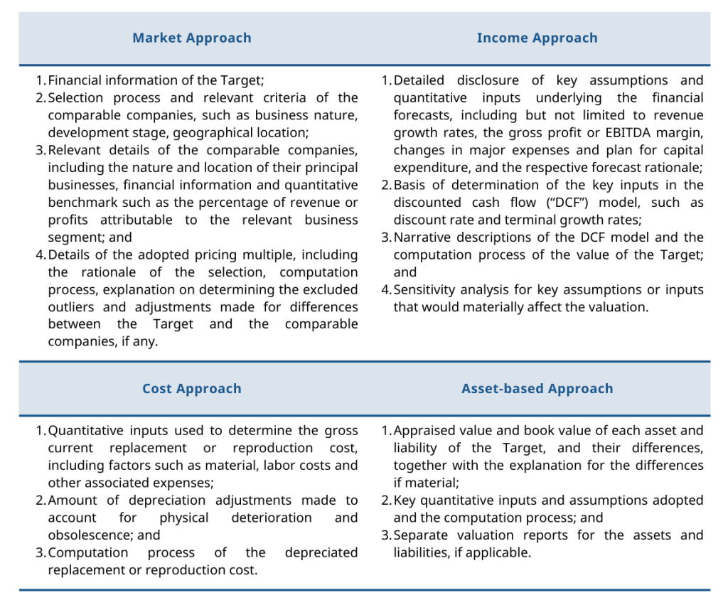 Guidance Letter emphasizes the need for listed companies to provide adequate explanation of the basis for determining the consideration of the transaction by disclosing sufficient and objective information with quantitative inputs and analysis to substantiate how the consideration was arrived at. The disclosure should be specific and not to be overly general and simplistic, allowing shareholders to understand how the valued amount was determined, and so as the consideration. The Guidance Letter provides guidance on the recommended disclosures and is divided into two sections. One for the disclosures in a business valuation report and the other for the transactions where no independent valuation is conducted.